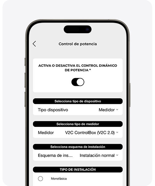 Una vez realizada la instalación del medidor correspondiente, es obligatorio configurar de manera óptima el control dinámico de potencia. Sin este paso, el e-Charger no asignará de manera automática y dinámica los excedentes de energía sobrantes de la vivienda o empresa a la carga del vehículo eléctrico.