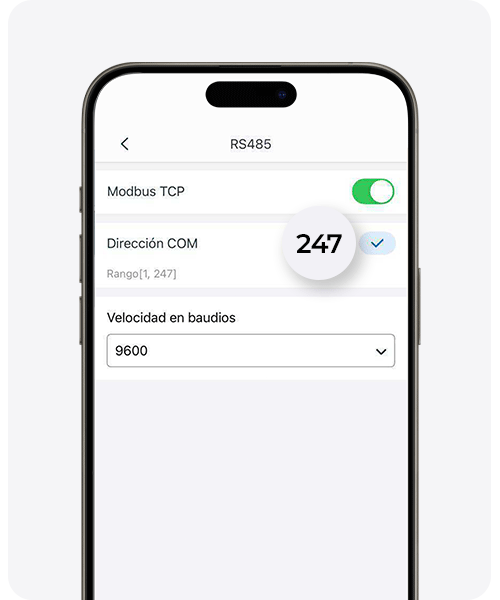 Habilita la opción ‘Modbus TCP’ e indica el valor 247 en el campo ‘Dirección COM’