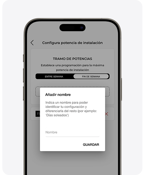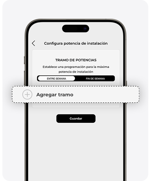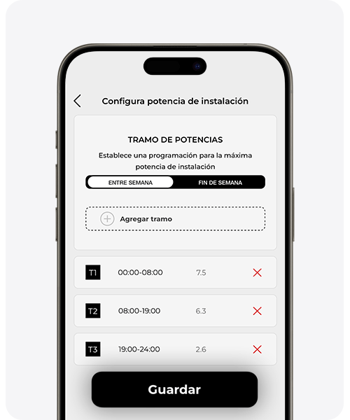 Accede al apartado ‘Perfiles de carga’ para planificar diferentes personalizaciones del control de potencia. Puedes configurar la selección de los tramos de potencia por horas y por potencia contratada, así como diferenciar entre fin de semana y entre semana.*