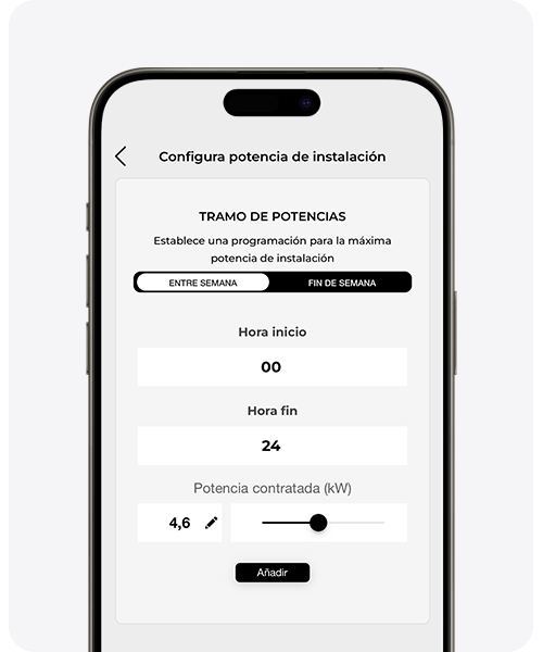 Accede al apartado ’Perfiles de carga’ para planificar distintas personalizaciones del control de potencia. En este apartado, podrás ajustar los rangos de potencia en función de las horas y la potencia contratada, diferenciando entre los días laborables y los fines de semana.
