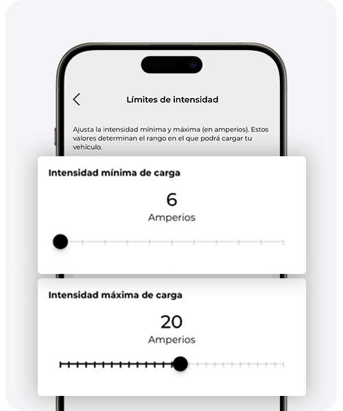 La función más básica de la personalización del control de potencia, sea cual sea tu e-Charger, te permite determinar el intervalo entre la intensidad mínima y máxima entre la que oscilará la carga con tan solo deslizar a izquierda o derecha.