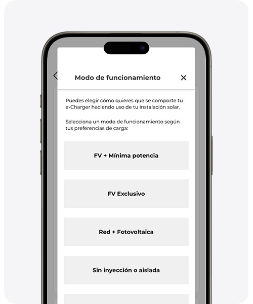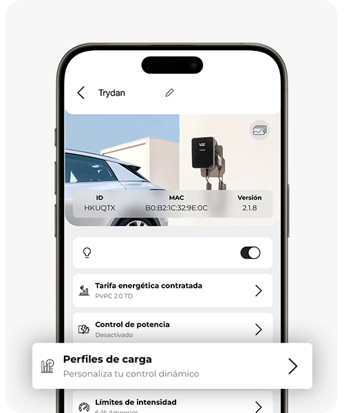 Igual que en las instalaciones que no disponen de energía fotovoltaica, puedes ajustar el control de potencia según tus necesidades tanto por Bluetooth como por WiFi (si dispones de esta conexión) con solo hacer clic en ’Perfiles de carga’.