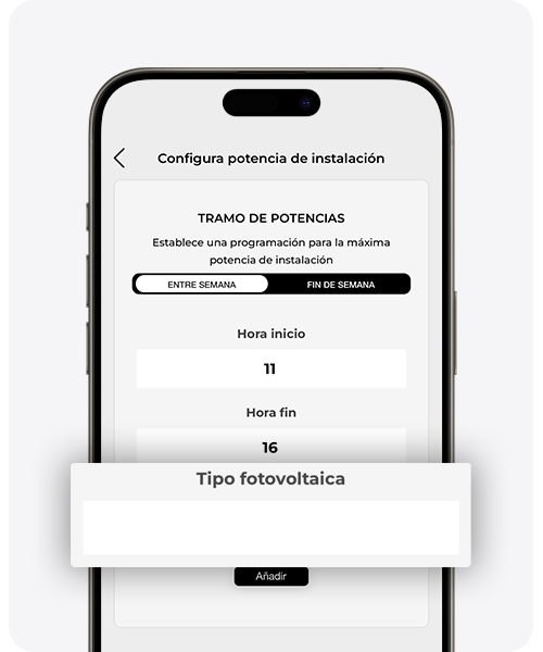 Debes configurar la potencia por horas y escoger el modo de energía que se utilizará para cada tramo de potencia. Además, en caso de que el modo seleccionado incluya energía de la red, debes introducir la potencia contratada.