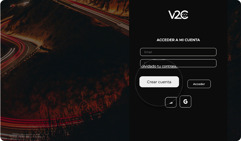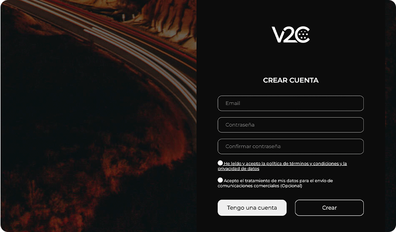 Una vez que hayas descargado la aplicación, para acceder desde la app o desde el ordenador (www.v2c.cloud), necesitarás crear una cuenta. Tienes tres opciones: