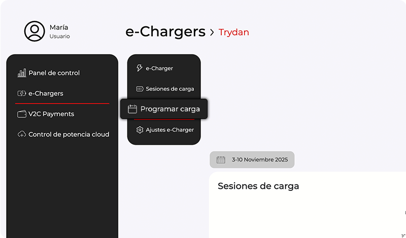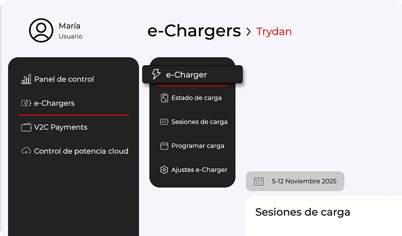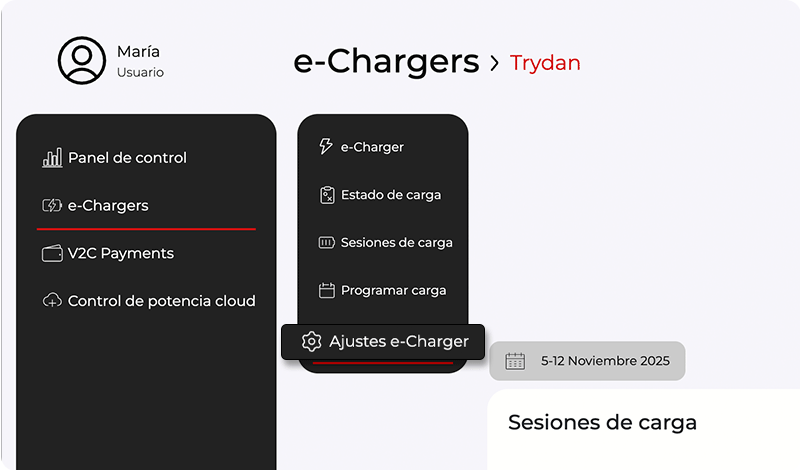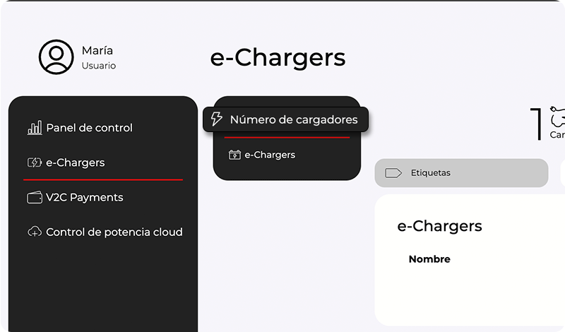 Para acceder a la sección E-Charger, basta con abrir el menú y seleccionar ese apartado en la lista de opciones.
