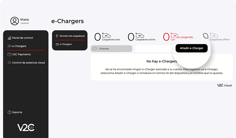 Haz clic en el botón Añadir E-Charger para agregar un nuevo dispositivo.