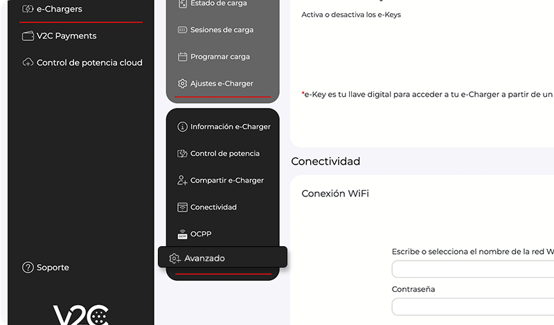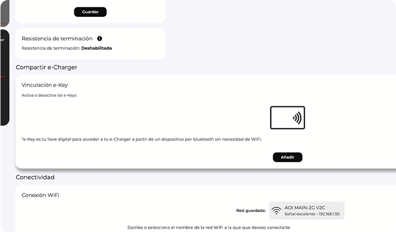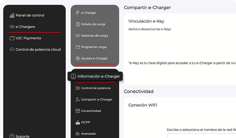 ATENCIÓN: Los ajustes de ‘Conectividad’ ya han sido explicados anteriormente. Asegúrate de haber configurado bien la conexión a la red WiFi para disponer de acceso a todas las funcionalidades del e-Charger.