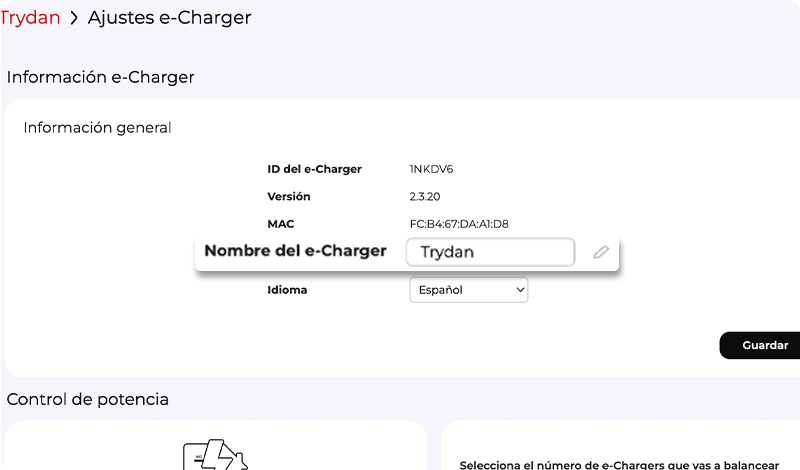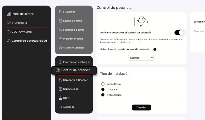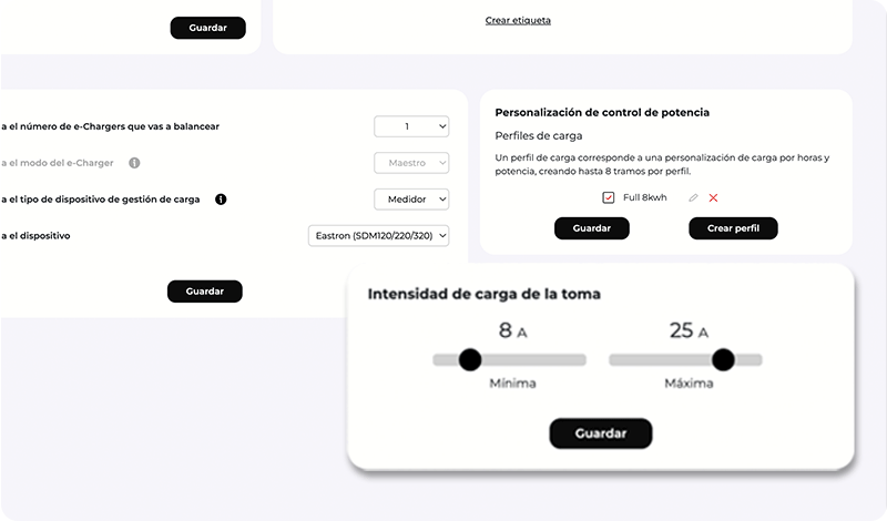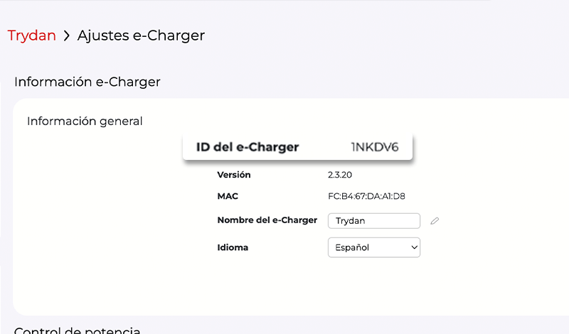 ATENCIÓN: Los ajustes de ‘Control de potencia’, ‘Perfiles de carga’ y ‘Límites de intensidad’ ya han sido explicados anteriormente. Asegúrate de haber configurado bien estos parámetros, ya que son esenciales para garantizar el correcto funcionamiento del e-Charger.