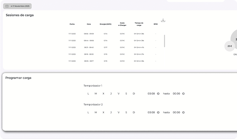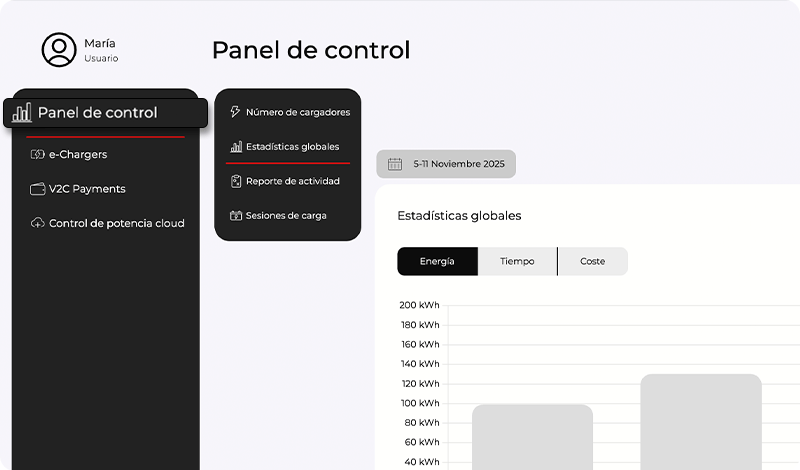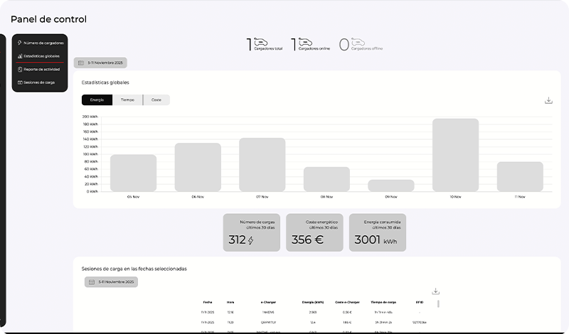 Es posible conocer las estadísticas tanto globales (en caso de contar con varios cargadores) como individuales de cada e-Charger. En ambos casos puedes consultar los kW/h, el tiempo de las cargas y su coste.