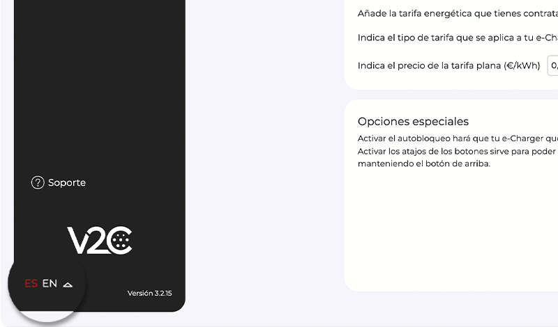 En este apartado puedes cambiar el idioma del cargador. Sin embargo, el idioma de la aplicación V2C Cloud se adapta al idioma que tengas configurado en tu dispositivo móvil.