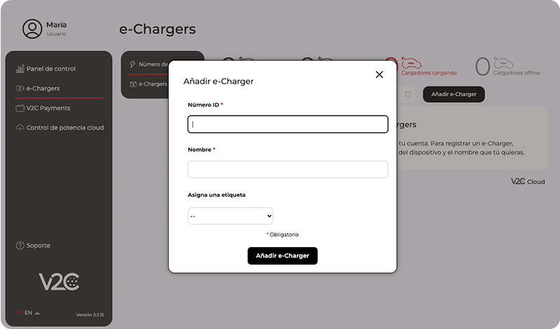 Puedes añadir un nuevo cargador en tu cuenta de usuario desde la aplicación móvil V2C Cloud o desde la plataforma web www.v2c.cloud.