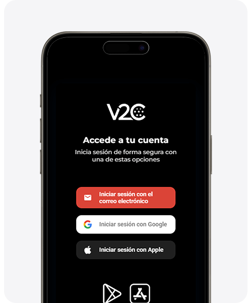 Una vez que hayas descargado la aplicación, para acceder desde la app o desde el ordenador (www.v2c.cloud), necesitarás crear una cuenta. Tienes tres opciones: