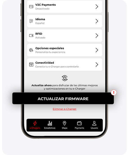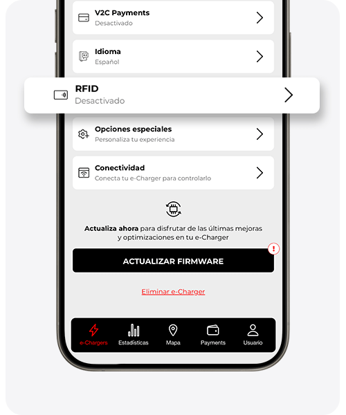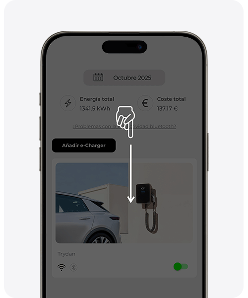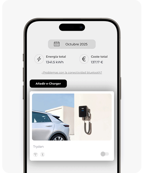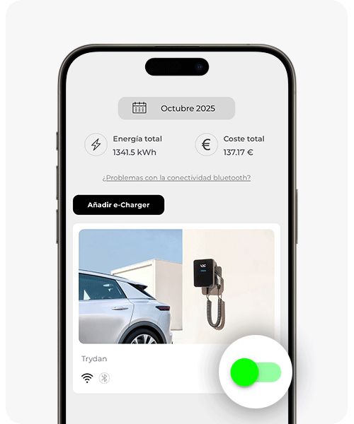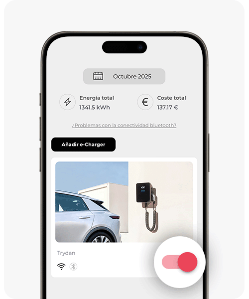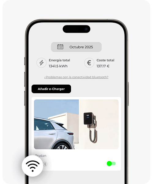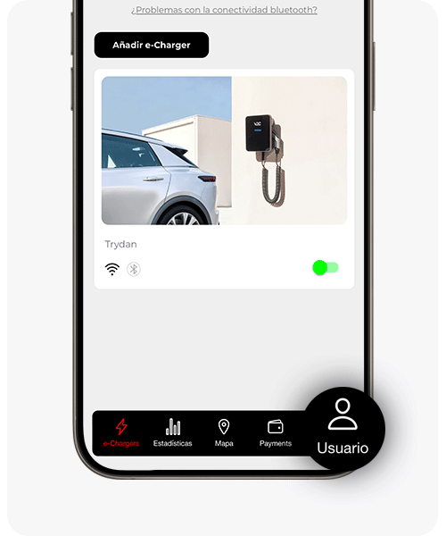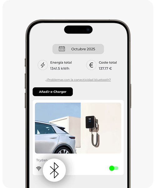 La conexión entre el punto de recarga y la aplicación se hace a través de Bluetooth, por tanto la señal Bluetooth de tu móvil debe estar activa y debes situarte a escasos metros del e-Charger.*