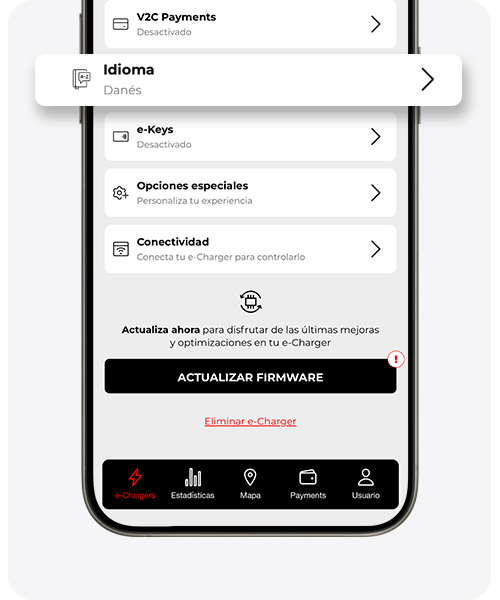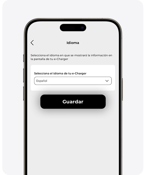 En este apartado puedes cambiar el idioma del cargador. Sin embargo, el idioma de la aplicación V2C Cloud se adapta al idioma que tengas configurado en tu dispositivo móvil.