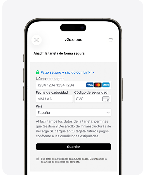 Si aún no tienes un método de pago añadido en V2C Payments, aparece una pantalla final donde deberás introducir los datos de tu tarjeta para completar el proceso y comenzar la carga.