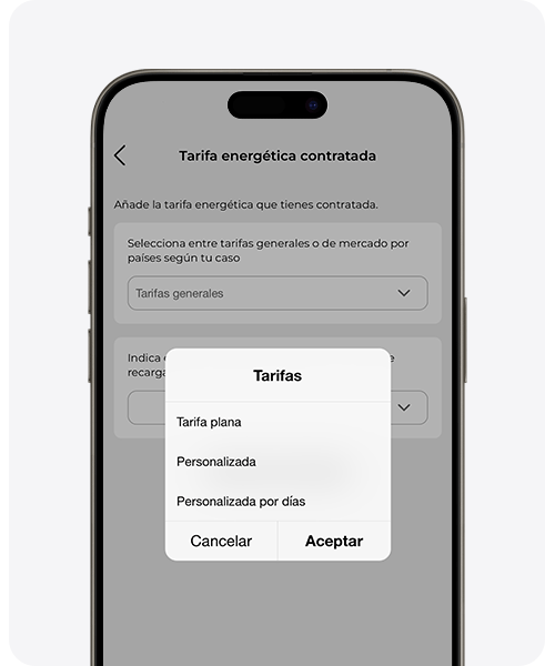 Permiten introducir manualmente el coste del kWh según tu contrato eléctrico. Elige un precio fijo del kWh (tarifa plana), un precio del kWh en función del rango de horas (personalizada) o un precio del kWh en función del rango de horas y días de la semana (personalizada por días). Si seleccionas esta última opción, desliza hacia la derecha para visualizar todos los días de la semana.