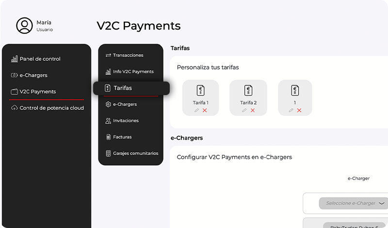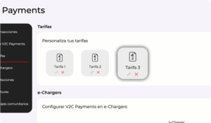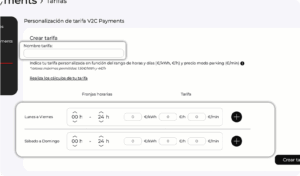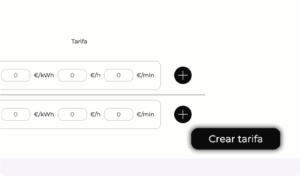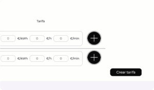 Desde la pantalla principal accede al apartado ‘V2C Payments’ y haz clic en ‘tarifas’. Es necesario definir al menos una tarifa para el correcto funcionamiento del sistema de pago. Para ello, haz clic en el botón ‘+‘.