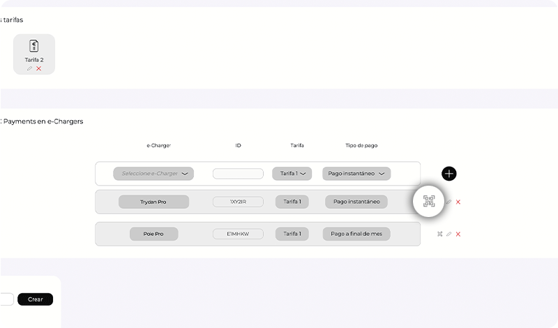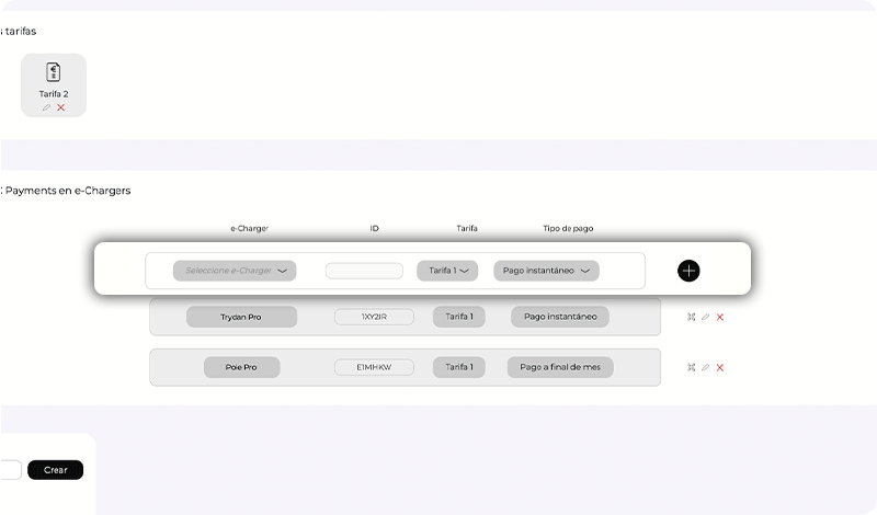 En el apartado e-Chargers selecciona el cargador, la tarifa que quieres asignar y el tipo de pago. Después haz clic en el botón ‘+’. El cargador debe estar conectado.