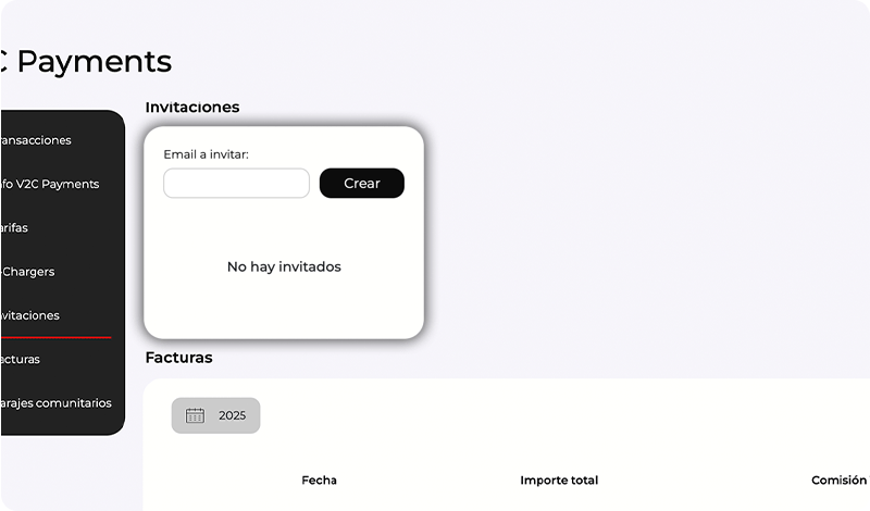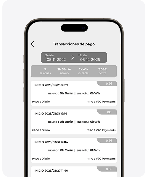 En el apartado ‘V2C Payments’ de la versión de escritorio tienes el control total de tu e-Charger. Entre otros, puedes consultar transacciones, ingresos o facturas.