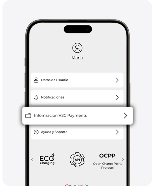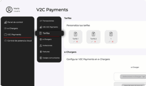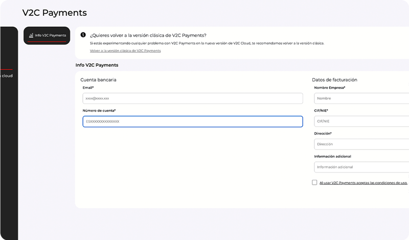 Una vez creada la cuenta en V2C Cloud, debes iniciar sesión desde la versión de escritorio y hacer clic en el apartado V2C Payments. Indica la cuenta bancaria en la que quieres recibir los ingresos de las cargas. Además, indica los datos de facturación para recibir las facturas de los ingresos de forma mensual.