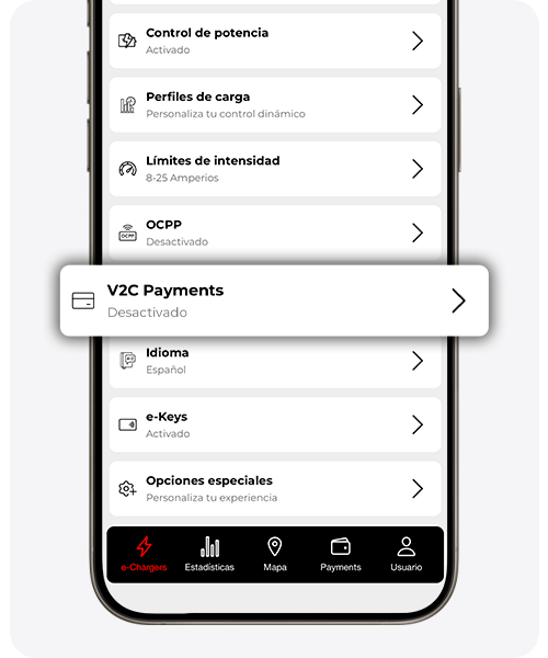 Es importante que compruebes que el cargador está siempre conectado a una red (WiFi o Ethernet) para el correcto funcionamiento de V2C Payments. En el portal web, accede a ‘e-Chargers’ y revisa su estado. No debe aparecer offline.