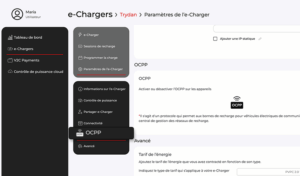 Dans l’application, une fois que vous avez sélectionné l’e-Charger que vous souhaitez conifuger, sélectionnez la section « OCPP » dans le menu de configuration. Activez le protocole et configurer correctement les données.