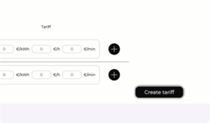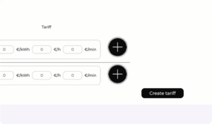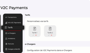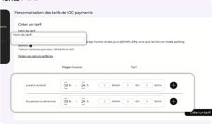 Depuis l’écran principal, accédez à la section « V2C Payments » et cliquez sur « Tarifs ». Il est nécessaire de définir au moins un tarif pour assurer le bon fonctionnement du système de paiement. Pour cela, cliquez sur le bouton « + ».