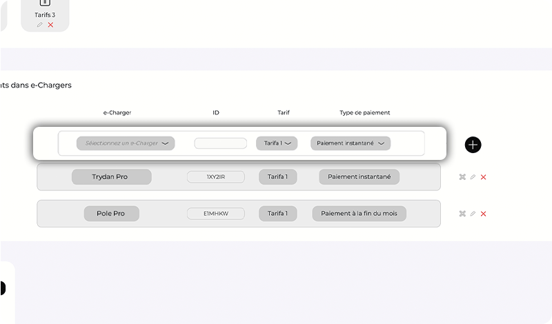 Dans la section e-Chargers, sélectionnez le chargeur, le tarif que vous souhaitez attribuer et le type de paiement. Pour effectuer cette action, le chargeur doit être connecté.