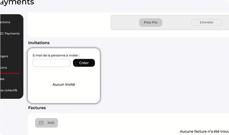 Si le promoteur souhaite partager le chargeur sans facturer aucun frais, il existe une méthode permettant de rendre le partage de l’e-Charger totalement gratuit. Depuis la section « Invitations », vous pouvez offrir l’utilisation de votre chargeur en saisissant simplement l’adresse e-mail de l’utilisateur.