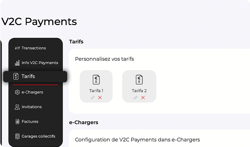 Une fois qu’au moins un tarif a été créé, il est nécessaire d’activer le système de paiement depuis l’application mobile ou le portail web. Veuillez noter que V2C émet une facture à la fin du mois et applique une seule commission de 5 %.