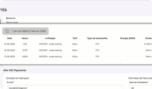 Dans la section « V2C Payments » de la version de bureau, vous avez un contrôle total sur votre e-Charger. Entre autres, vous pouvez consulter les transactions, les revenus ou les factures.