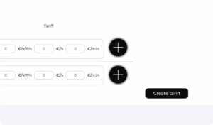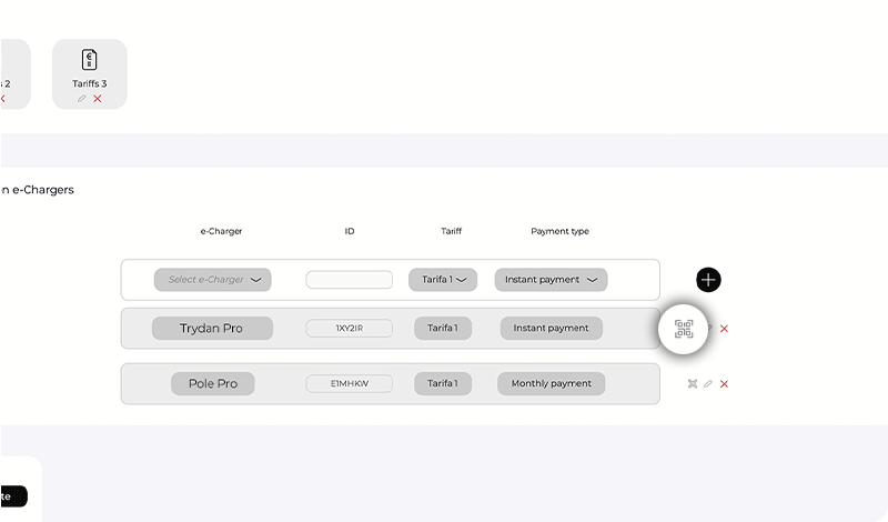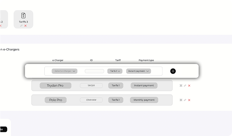 Nella sezione e-Chargers, seleziona il caricatore, la tariffa che vuoi assegnare e il tipo di pagamento. Quindi, fai clic sul pulsante “+”. Il caricatore deve essere connesso.