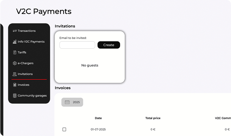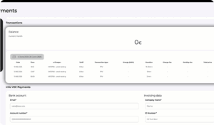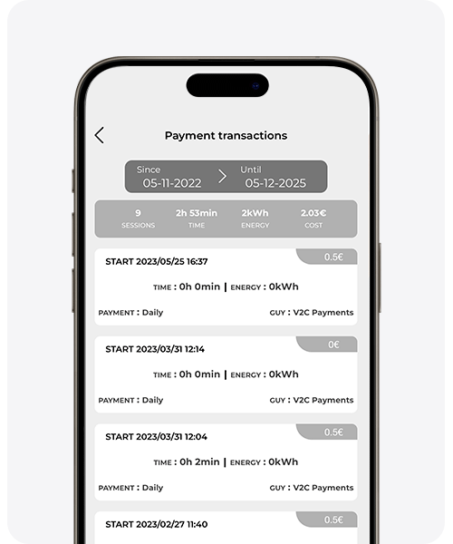 Nella sezione ‘V2C Payments’ della versione desktop hai il controllo totale del tuo e-Charger. Tra le altre cose, puoi controllare transazioni, entrate o fatture.