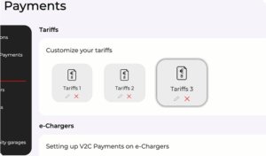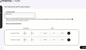 Dalla schermata principale, accedi alla sezione “V2C Payments” e fai clic su “Tariffe”. È necessario definire almeno una tariffa per il corretto funzionamento del sistema di pagamento. Per farlo, fai clic sul pulsante “+”.