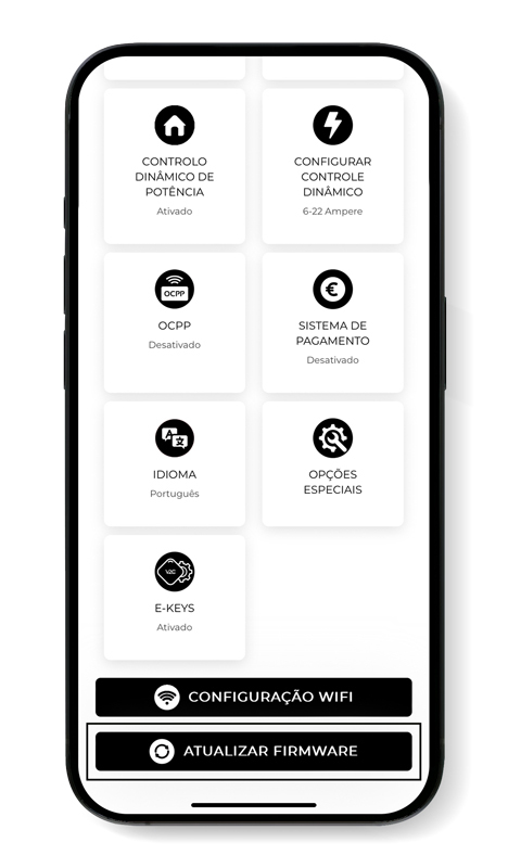 Se durante a atualização o e-Charger ficar “preso” num ecrã ou deixar de responder, é aconselhável reiniciar o dispositivo e repetir os passos novamente.